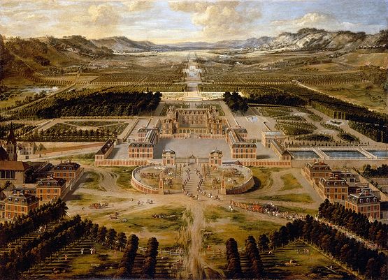 Les premiers pavillons de Versailles, visibles à droite et à gauche du tableau (ils sont au nombre de 6, 3 de chaque côté)