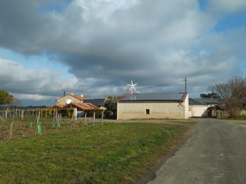 Une ferme dans un hameau qui intègre des dispositifs d’énergie renouvelables (panneaux photovoltaïques et éolienne de toit)