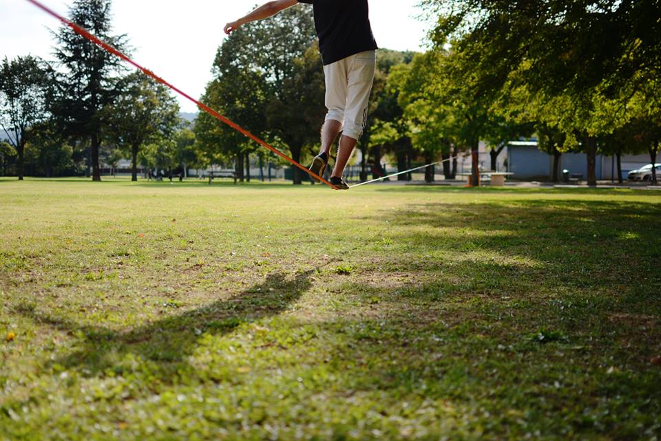 Si vous ignorez tout de la slackline, rassurez vous, ce n’est pas essentiel pour la suite de l’article, mais je prends un instant pour rappeler que c’est une discipline sportive, proche du funambulisme, qui se joue sur une sangle molle et dont le but consiste à marcher sur cette sangle combattant les forces de l’équilibre pour rester sur le fil. La pratique de la slackline peut très facilement se faire en ville car elle demande peu de matériel : une sangle, son système d’accroche et de tension et deux supports porteurs. Les arbres en l’occurrence font très bien l’affaire et les slackeurs aiment utiliser les parcs comme aire d’entrainement.