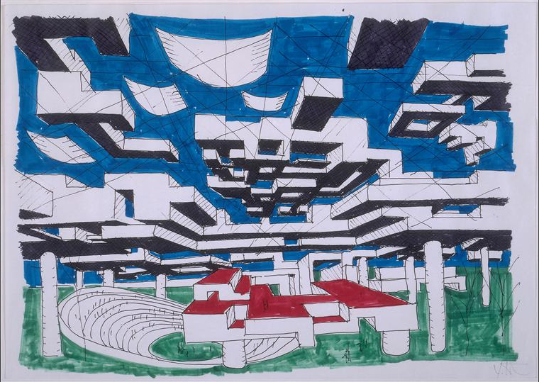 Un simple dessin à l’encre et au feutre sur une feuille de papier. Des lignes claires et presque enfantines, des volumes qui sont décomposés par une palette chromatique sobre : rouge, bleu, vert et noir. Les lignes de construction du dessin transparaissent au travers des formes tandis que se détachent quatre plans dans l’espace. Le sol, vert, qui accueille un immense amphithéâtre ou des gradins disposés de façon circulaire, et dans lequel semble-t-il, apparaissent des silhouettes humaines. Un deuxième plan composé de bâtiments sur pilotis, rouges – ou plutôt d’un ensemble de formes reposant sur deux gros cylindres – se trouve à mi-hauteur, légèrement au-dessus des gradins. Le troisième plan est un champ astéroïdal de bâtiments, noirs, qui flottent au-dessus du sol et envahissent le ciel. Ils ne flottent pas totalement, car comme le premier plan, ils reposent partiellement sur des pilotis, de gros cylindres très épais qui s’élancent dans le ciel. Le quatrième plan est caché par le troisième, mais il est bien présent. Il s’agit du ciel, bleu, qui marque l’horizon et ferme le dessin.