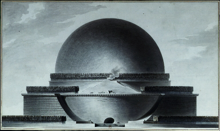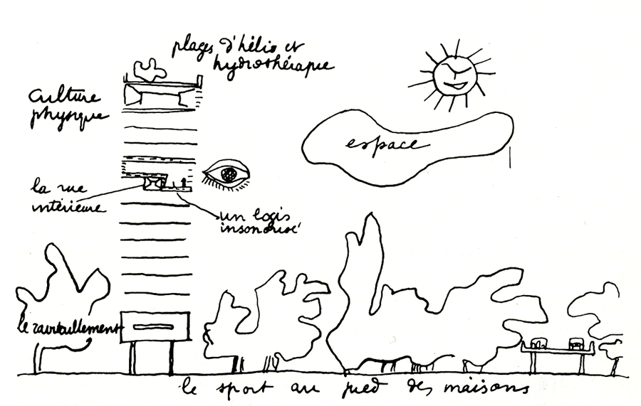 La représentation est également le support d’un discours. Dans la recherche d’anticipation, telle que nous le présentait CDu dans son article, la représentation est bien le moyen de porter le discours sur les possibilités du futur, sur les innovation formelles et techniques recherchées. La représentation architecturale du projet est un outil au service du discours de l’architecte. Chaque architecte trouve son expression personnelle dans sa façon de représenter le projet, il livre une part de lui-même dans le choix du point de vue, des formes et des couleurs, mais surtout, il construit un discours par le dessin. Et à la grande différence du discours écrit ou du langage oral, la représentation ne construit pas un discours linéaire et continu, elle dresse un jeu itératif de formes et de couleurs, qui, confrontées entre elles, peuvent exprimer plusieurs choses à la fois. Le discours idéologique se mêle souvent au discours graphique pour communiquer autour du projet. La pensée de l’architecte penseur de la société se mêle à celle du concepteur d’espace, le dessin devient alors le réceptacle et la vitrine d’un modèle social. Etienne-Louis Boullée à la fin du XVIIIe siècle ou Le Corbusier au XXe, ont chacun utiliser la représentation pour inscrire leur idéologie dans le temps et dans l’espace.